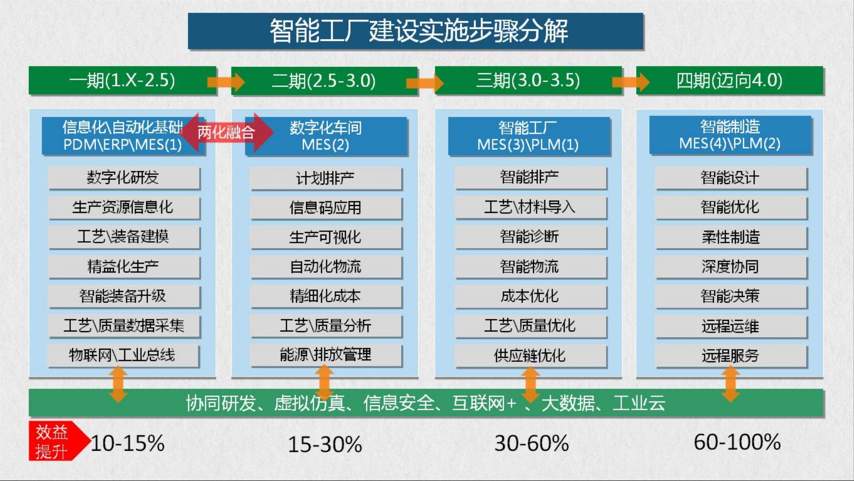智能工廠一、二期階段已經(jīng)逐步部署完成。PDM系統(tǒng)完成“數(shù)字化研發(fā)”產(chǎn)品設(shè)計(jì)、“工藝\裝備建模”產(chǎn)品生產(chǎn)規(guī)范要求;ERP系統(tǒng)實(shí)現(xiàn)“生產(chǎn)資源信息化”、“物聯(lián)網(wǎng)\工業(yè)總線”、“計(jì)劃排單”等基礎(chǔ)數(shù)據(jù)網(wǎng)絡(luò)化;MES系統(tǒng)完成“精益化生產(chǎn)”、“工藝\質(zhì)量采集”、“信息 碼應(yīng)用”、“生產(chǎn)可視化”、“工藝\質(zhì)量分析”工作,實(shí)現(xiàn)智能生產(chǎn)、安全生產(chǎn);WAP移動(dòng)倉(cāng) 儲(chǔ)系統(tǒng)實(shí)現(xiàn)“自動(dòng)化物流”,提升倉(cāng)庫(kù)存儲(chǔ)空間利用率,實(shí)現(xiàn)倉(cāng)儲(chǔ)作業(yè)的自動(dòng)化,提升工作效率。