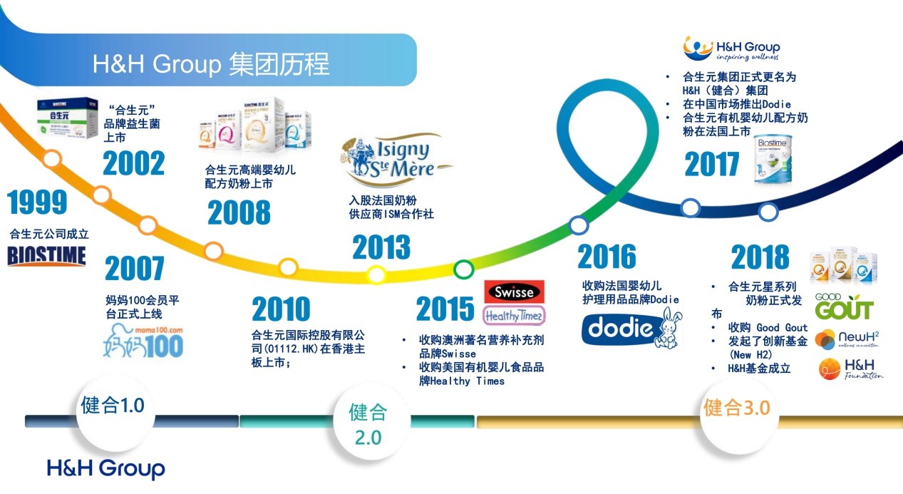H&H (健合)集團(tuán)成立于1999年,在 2010年12月17日于香港交易所主板上市(股票代碼:1112)。集團(tuán)致力于嬰兒營(yíng)養(yǎng)與護(hù)理領(lǐng)域和優(yōu)質(zhì)的維生素補(bǔ)充劑領(lǐng)域兩大核心業(yè)務(wù)。健合集團(tuán)秉承讓人們更健康更快樂的使命, 致力于創(chuàng)造差異化的優(yōu)質(zhì)產(chǎn)品及令人向往的品牌,成為全球高端營(yíng)養(yǎng)及健康產(chǎn)業(yè)領(lǐng)導(dǎo)者。