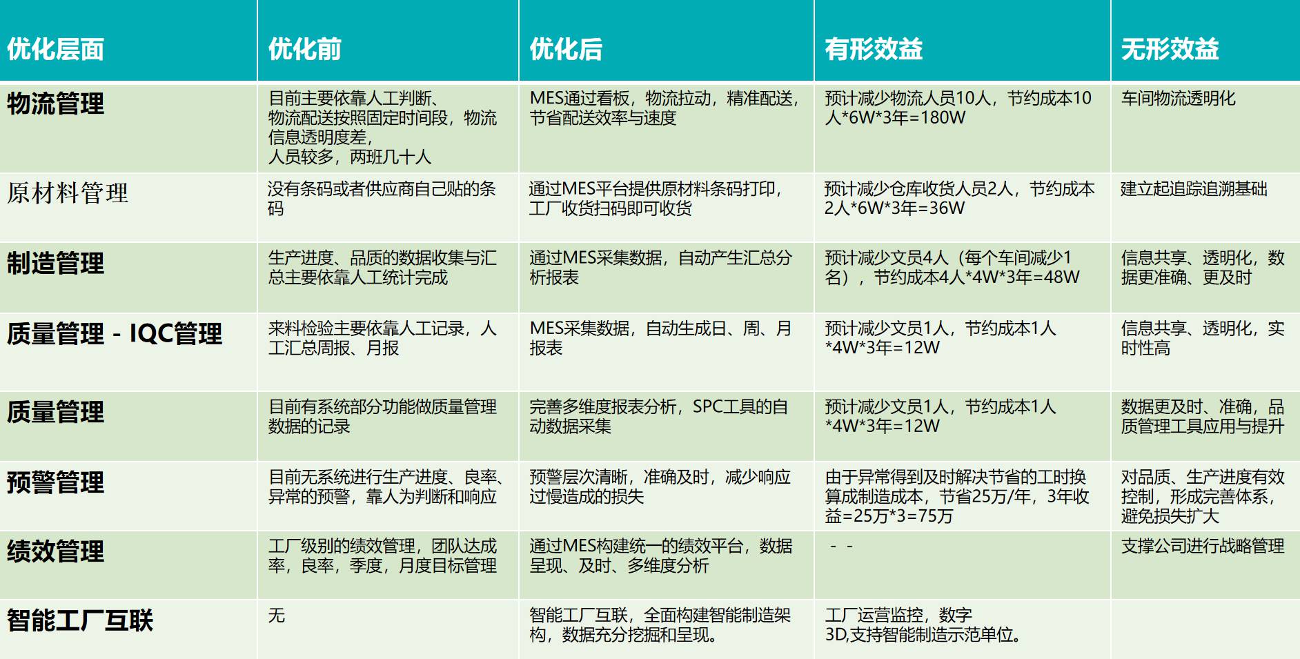 項目成功實施情況下,3年累計工廠預計最低節(jié)省成本有形效益363萬;5年預期效益超過605萬。