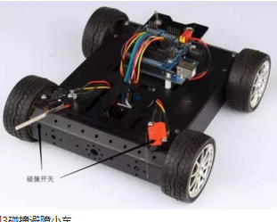 在機器人比賽中,碰撞開關經常被用在碰撞壁障小車上。小車前端的碰撞開關在碰撞到障礙物時就會給控制器反饋一個信號,告訴控制器前方左側或右側有障礙物,程序再控制小車轉彎避開障礙物。