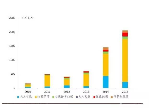 首先,人工智能產(chǎn)業(yè)的投資逐年增加。資本是最靈敏的風(fēng)向標(biāo)。從已經(jīng)披露的人工智能領(lǐng)域投資來看,2011 年到2016 年的五年間,無論是總體融資額還是交易次數(shù)都在逐年上升,人工智能領(lǐng)域的創(chuàng)投金額5年間增長了12 倍。