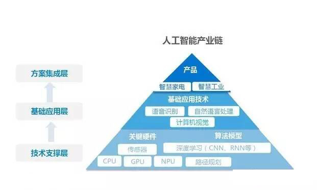 從人工智能自身的產(chǎn)業(yè)鏈來看,人工智能可以分成技術(shù)支撐層、基礎(chǔ)應(yīng)用層和產(chǎn)品層。
