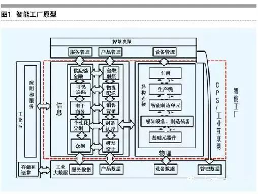 企業(yè)基于CPS和工業(yè)互聯(lián)網(wǎng)構(gòu)建的智能工廠原型,主要包括物理層、信息層、大數(shù)據(jù)層、工業(yè)云層、決策層。其中,物理層包含工廠內(nèi)不同層級的硬件設(shè)備,從最小的嵌入設(shè)備和基礎(chǔ)元器件開始,到感知設(shè)備、制造設(shè)備、制造單元和生產(chǎn)線,相互間均實現(xiàn)互聯(lián)互通。以此為基礎(chǔ),構(gòu)建了一個“可測可控、可產(chǎn)可管”的縱向集成環(huán)境。信息層涵蓋企業(yè)經(jīng)營業(yè)務(wù)各個環(huán)節(jié),包含研發(fā)設(shè)計、生產(chǎn)制造、營銷服務(wù)、物流配送等各類經(jīng)營管理活動,以及由此產(chǎn)生的眾創(chuàng)、個性化定制、電子商務(wù)、可視追蹤等相關(guān)業(yè)務(wù)。在此基礎(chǔ)上,形成了企業(yè)內(nèi)部價值鏈的橫向集成環(huán)境,實現(xiàn)數(shù)據(jù)和信息的流通和交換。