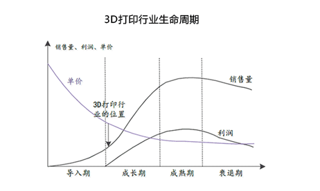 3D打印經(jīng)過了近 40 年的發(fā)展,龍頭公司開始實現(xiàn)顯著盈利,市場認(rèn)可度快速上升,行業(yè)收入增長加速。根據(jù)典型的產(chǎn)品生命周期理論,技術(shù)產(chǎn)品從導(dǎo)入期進入成長期的過程中往往表現(xiàn)出加速增長的特征,判斷目前3D打印產(chǎn)業(yè)正在進入加速成長期。