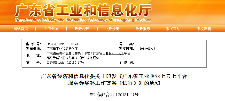 根據廣東省經濟和信息化委關于印發(fā)《廣東省工業(yè)企業(yè)上云上平臺服務服務券獎補工作方案(試行)》的通知指示,重點支持工業(yè)企業(yè)依托工業(yè)互聯網平臺商和服務商,圍繞研發(fā)設計、生產管控、經營管理、售后服務等核心業(yè)務環(huán)節(jié),利用工業(yè)互聯網新技術、新模式,實施數字化網絡化智能化升級,進一步降低經營成本、提升生產效率、提高產品質量、降低能耗排放、優(yōu)化產業(yè)協同等。重點包括:重點面向生產制造環(huán)節(jié)、重點面向中小工業(yè)企業(yè)、重點面向初級應用階段的年收入2千萬以上中小型企業(yè),最高獎補50萬/年。本政策持續(xù)三年(2018年-2020年)。