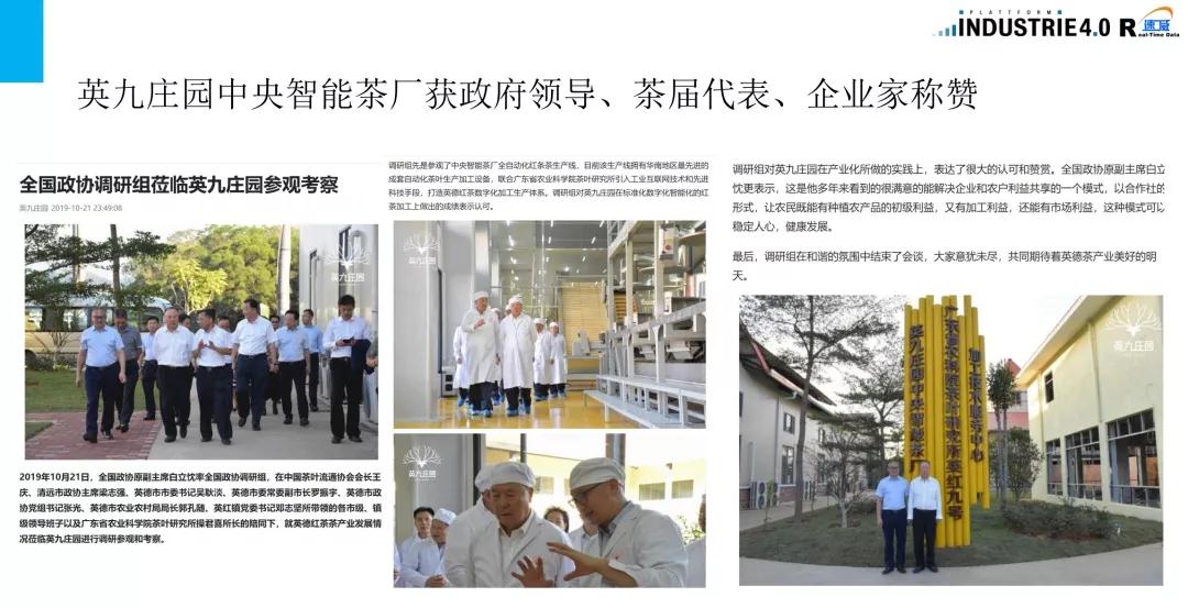 郭老師分享了2019年廣東省工業(yè)互聯(lián)網(wǎng)上云上平臺(tái)的中小工業(yè)企業(yè)典型案例-英德市英九莊園綠色產(chǎn)業(yè)有限公司作為英德優(yōu)質(zhì)產(chǎn)品品質(zhì)供應(yīng)鏈能力的高科技、全產(chǎn)業(yè)鏈品牌茶葉現(xiàn)代化企業(yè)英九莊園實(shí)施時(shí)間僅3周,便實(shí)現(xiàn)了從原材料茶青投料到產(chǎn)品包裝下線全過(guò)程100多臺(tái)設(shè)備的聯(lián)網(wǎng)、數(shù)據(jù)采集與控制,實(shí)現(xiàn)人機(jī)料法環(huán)測(cè)等要素的實(shí)時(shí)連接、通信與控制以及茶葉的全程質(zhì)量追溯,獲政府領(lǐng)導(dǎo)、茶界代表、企業(yè)家的練練稱贊。