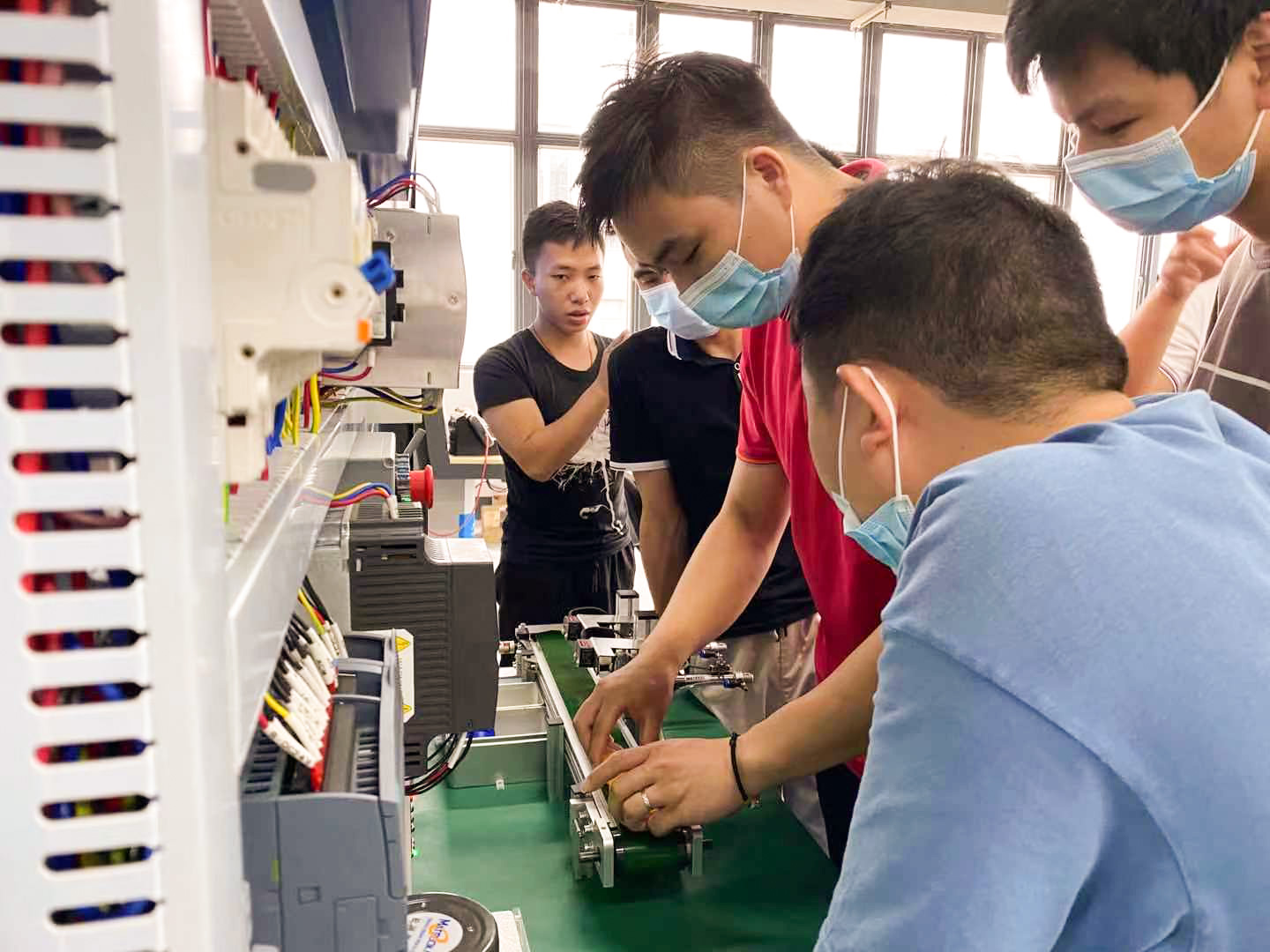接下來,成員們被分成三組,分組上臺操作實(shí)訓(xùn)設(shè)備。