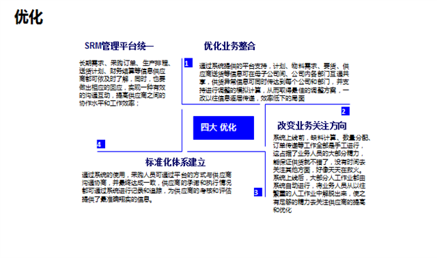 四、速威SRM云平臺(tái)的優(yōu)勢(shì):優(yōu)化業(yè)務(wù)整合、改變業(yè)務(wù)關(guān)注方向、標(biāo)準(zhǔn)化體系建設(shè)、統(tǒng)一SRM管理平臺(tái)