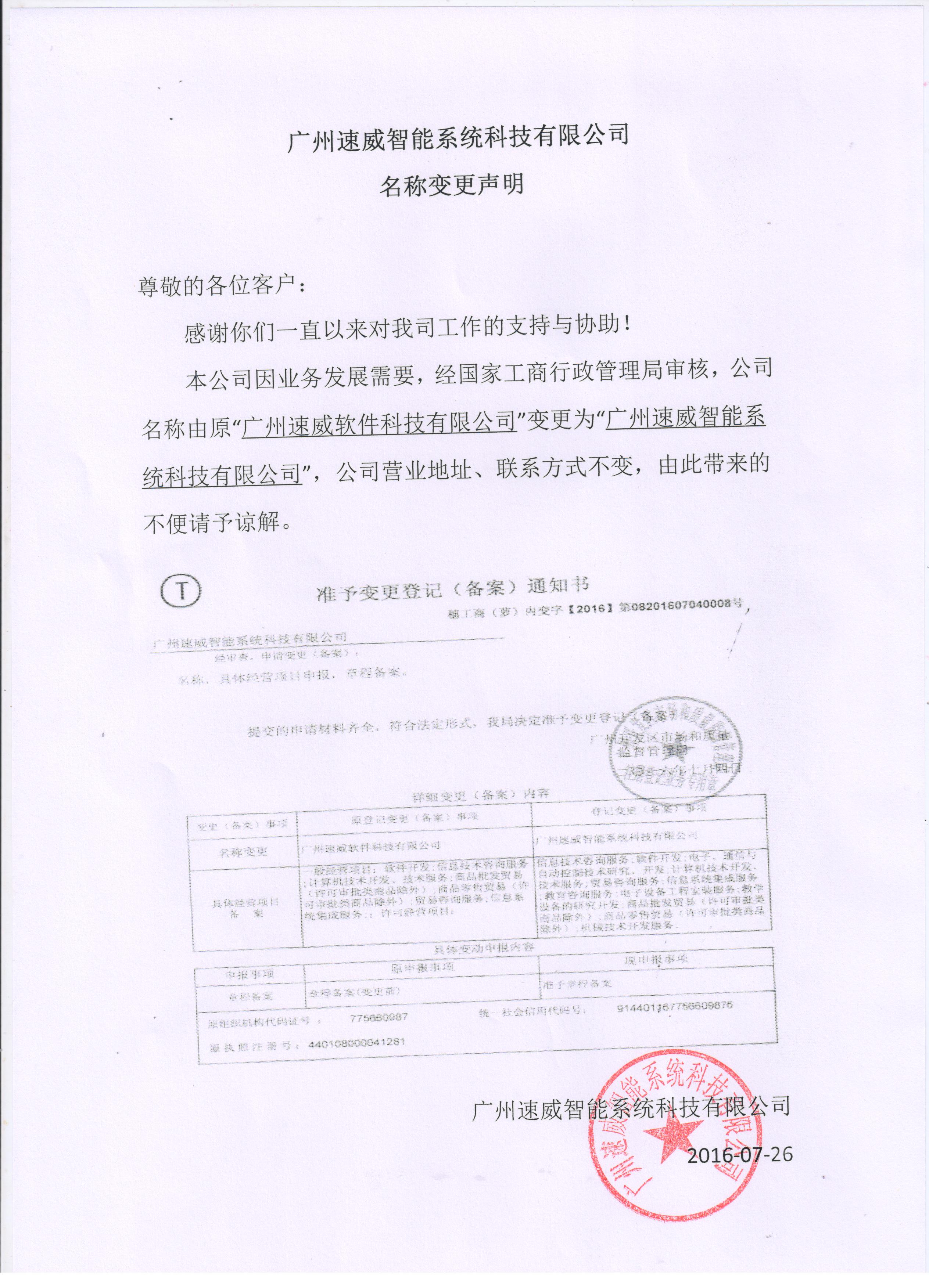 感謝朋友們10+年對(duì)本公司的支持。因業(yè)務(wù)需要,公司由《廣州速威軟件科技有限公司》更名為《廣州速威智能系統(tǒng)科技有限公司》。同時(shí)業(yè)務(wù)范圍也拓展為: