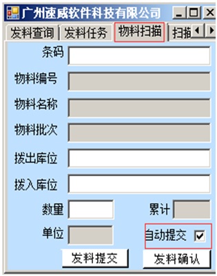 b、用PDA掃描物料的條碼,系統(tǒng)自動找到該發(fā)料任務并提交。