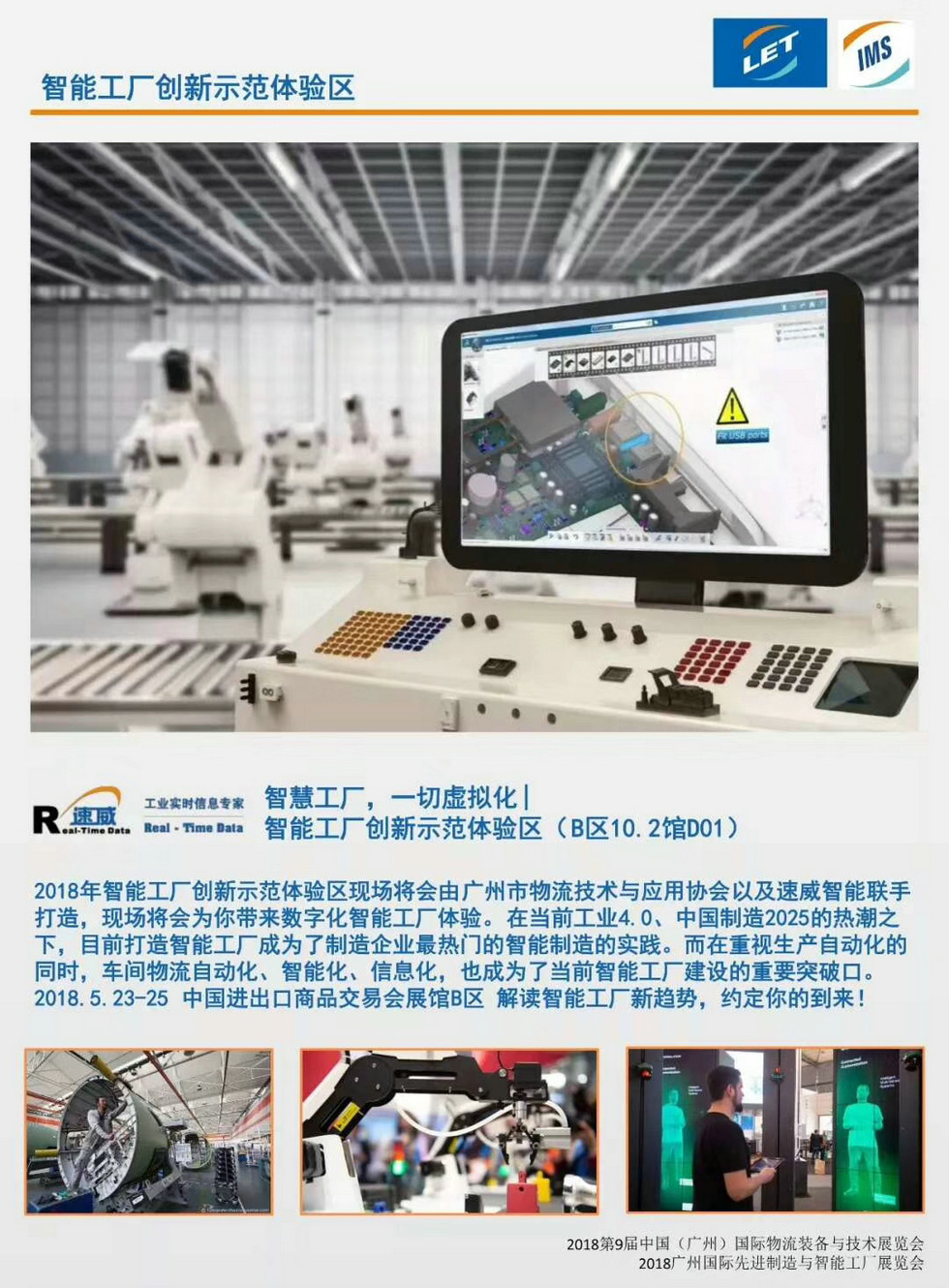 2018第9屆中國(廣州)國際物流裝備與技術(shù)展覽會、2018廣州國際先進(jìn)制造與智能工廠展覽會于2018年5月23日在廣州琶洲廣交會展覽B區(qū)10.2、11.2館進(jìn)行。速威參展地點(diǎn)位于B區(qū)10.2館D01。展會布展各項(xiàng)工作正在火熱進(jìn)行中。