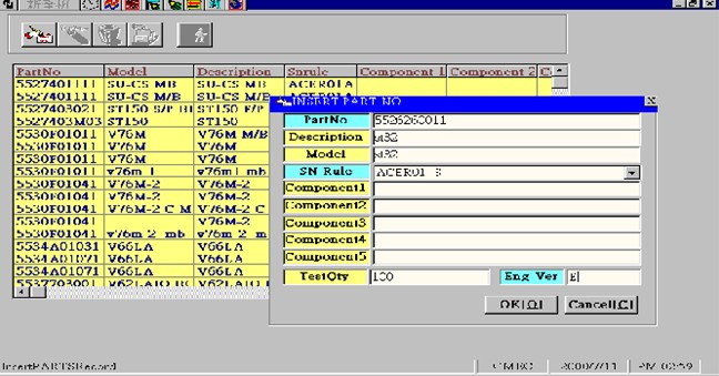 該功能主要是維護(hù)產(chǎn)品的型號(hào)資料,包括產(chǎn)品型號(hào)、規(guī)格、組成該產(chǎn)品的主要零配件、工程版本等,以及該成品的條形碼定義規(guī)則(在基本資料管理進(jìn)行設(shè)置)。例:新產(chǎn)品新增界面: