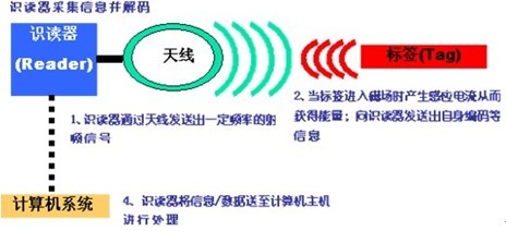 ⑤固定式讀寫器、手持式讀寫器 采用RFID芯片及天線、控制器、控制軟件等設(shè)備構(gòu)成射頻標(biāo)簽管理系統(tǒng),這是一種前瞻性的物流設(shè)施設(shè)備,系統(tǒng)中的閱讀器將高頻的加密數(shù)據(jù)載波信號(hào)經(jīng)發(fā)射天線向外發(fā)送,射頻卡進(jìn)入低頻的發(fā)射天線工作區(qū)域后被激活,同時(shí)將加密的載有目標(biāo)識(shí)別碼載波信號(hào)經(jīng)芯片線圈內(nèi)高頻發(fā)射出去,接收天線接收到射頻信號(hào)后,經(jīng)閱讀器接收處理后,提取出目標(biāo)識(shí)別碼至計(jì)算機(jī),完成預(yù)設(shè)的系統(tǒng)功能和自動(dòng)識(shí)別,實(shí)現(xiàn)目標(biāo)的自動(dòng)化管理。工作頻率:13.56MHZ,感測(cè)距離:0~1M。 RFID讀寫器網(wǎng)絡(luò)流程圖